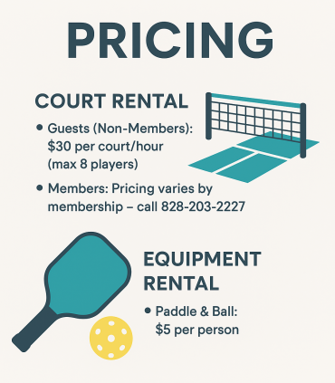 Pricing Court rental Guests (Non-Members): $30 per court/hour (max 8 players)Members: Pricing varies by membership – call 828-203-2727 eQUIPMENT rENTAL Paddle & Ball: $5 per person